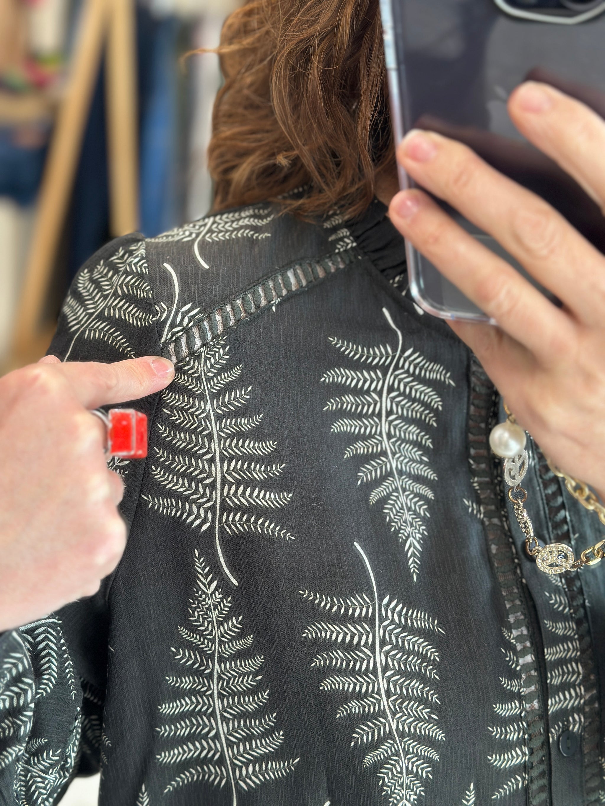 Blouse vert kaki à motifs feuillages beiges, coupe fluide et col boutonné - Abana Boutique 64480