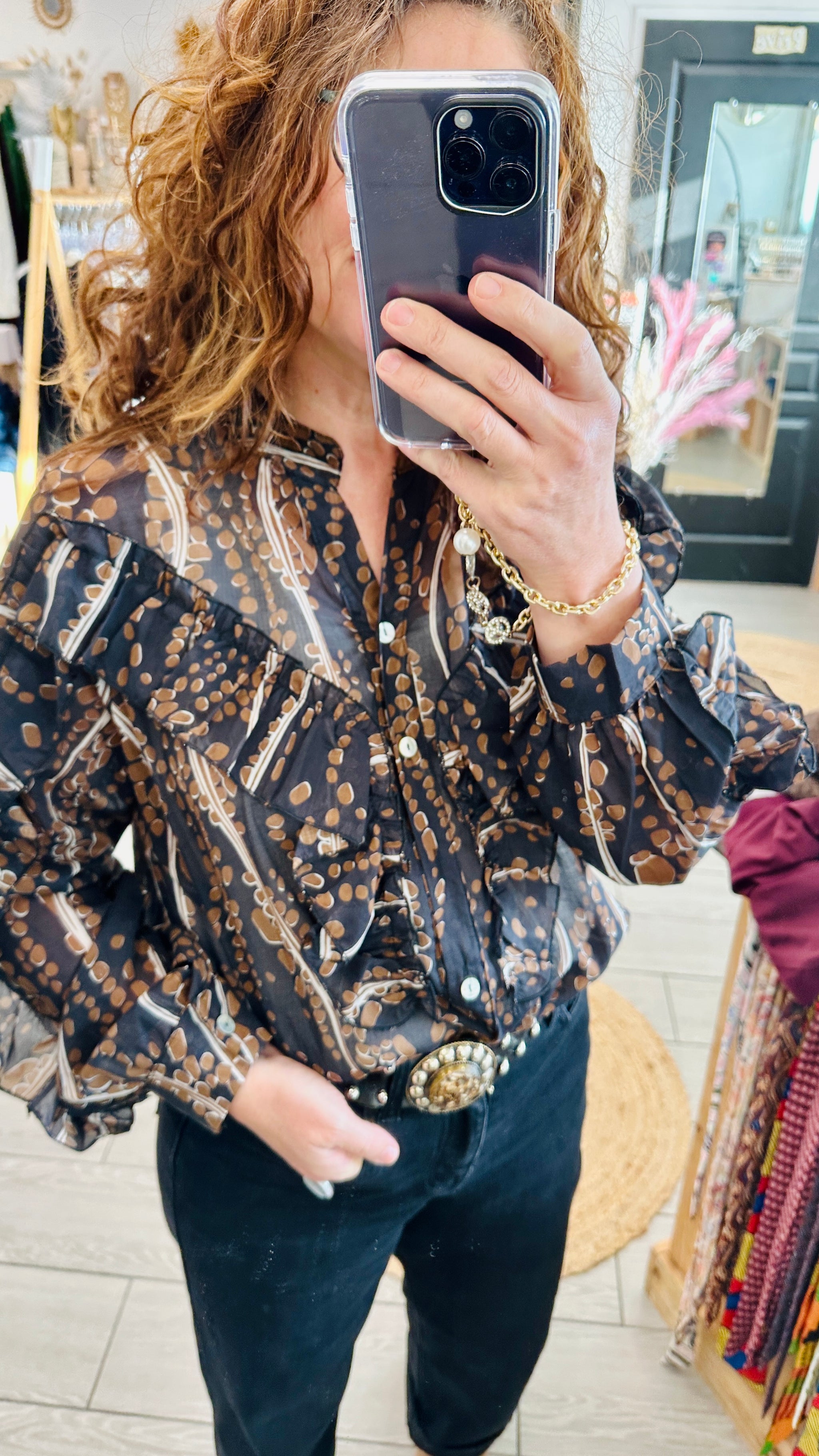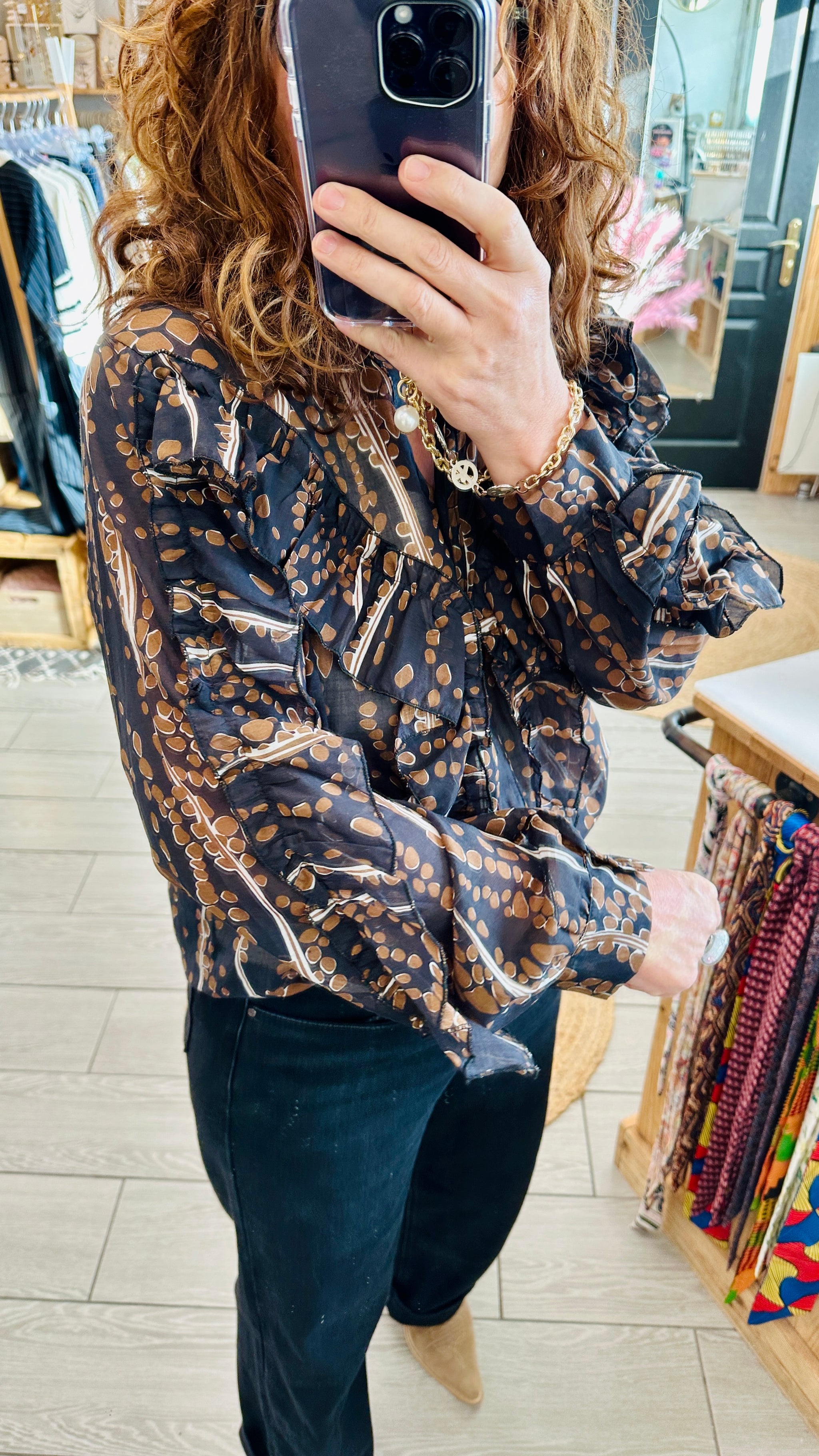 Avec son joli imprimé chocolat réchauffé de touches beiges, ses volants délicats sur le buste, et sa matière 100 % coton légère et agréable, il est à la fois romantique, structuré et facile à porter. Un vrai coup de cœur pour un look casual-chic plein de personnalité.