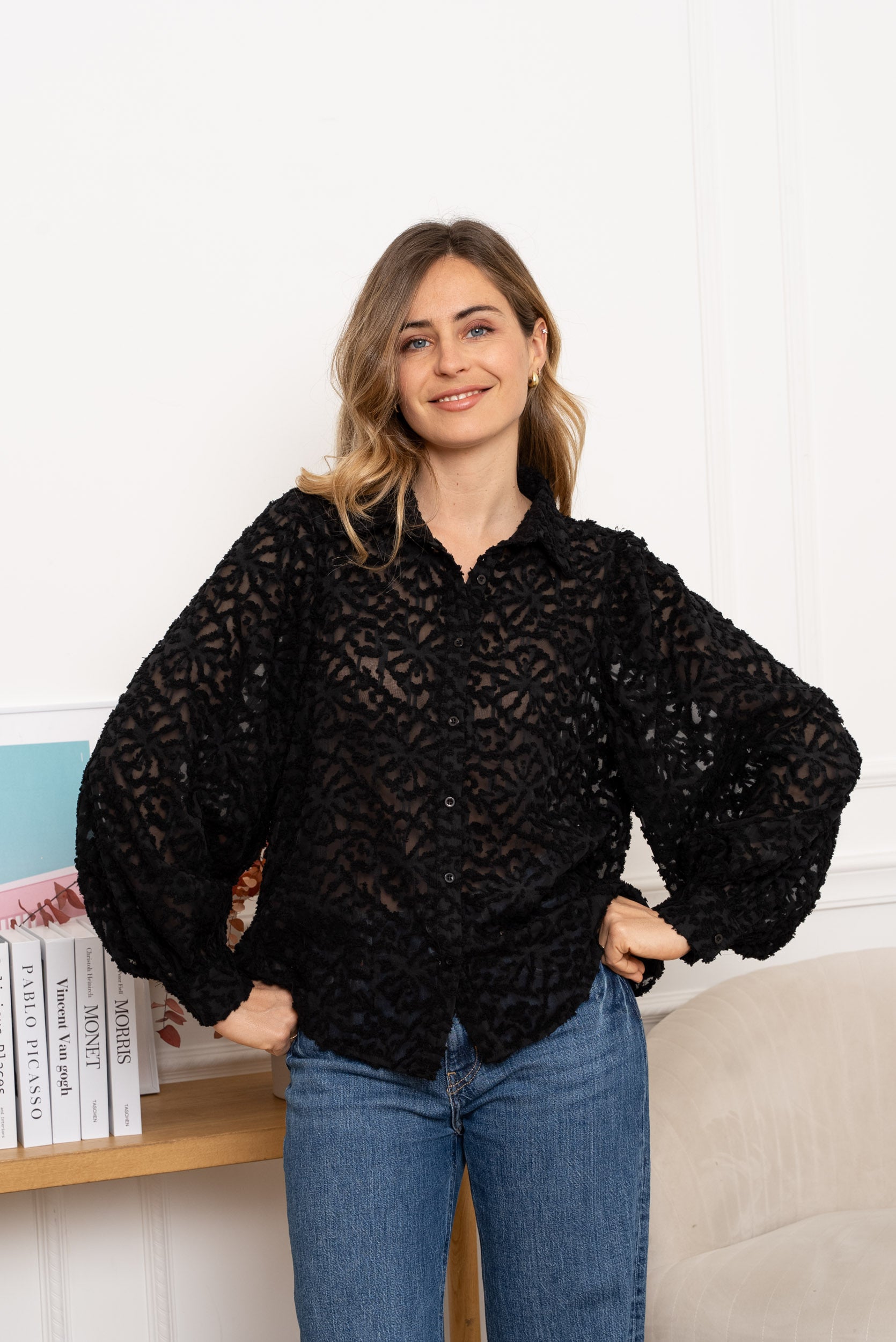 • Chemise noire en dentelle ajourée