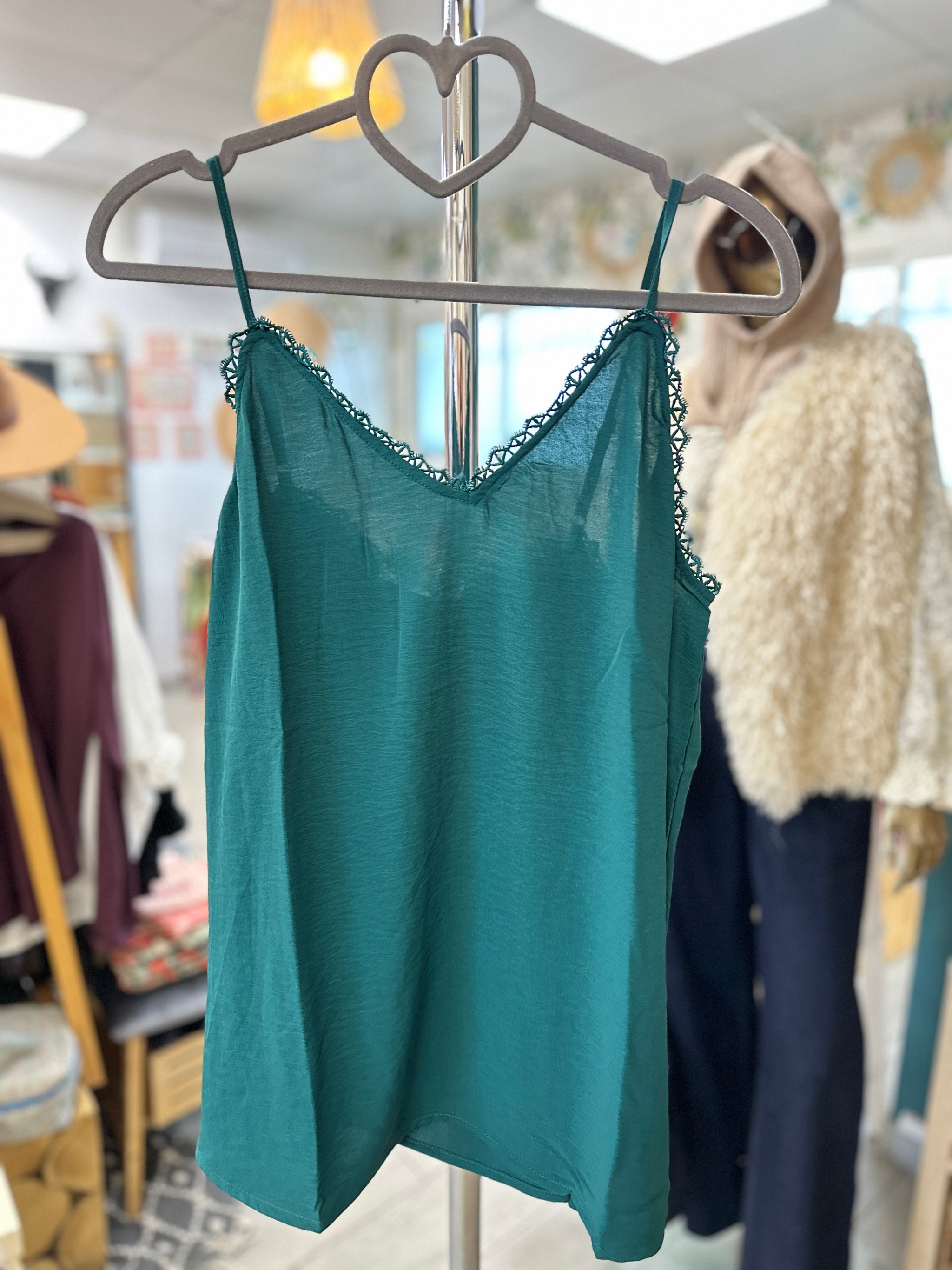 Avec sa dentelle délicate sur le décolleté, ses fines bretelles et sa coupe fluide, il est parfait en superposition ou porté seul dès que les beaux jours reviennent. Disponible en noir et en vert, c’est une pièce facile à vivre et à associer, pensée pour toutes les femmes du 40 au 46.