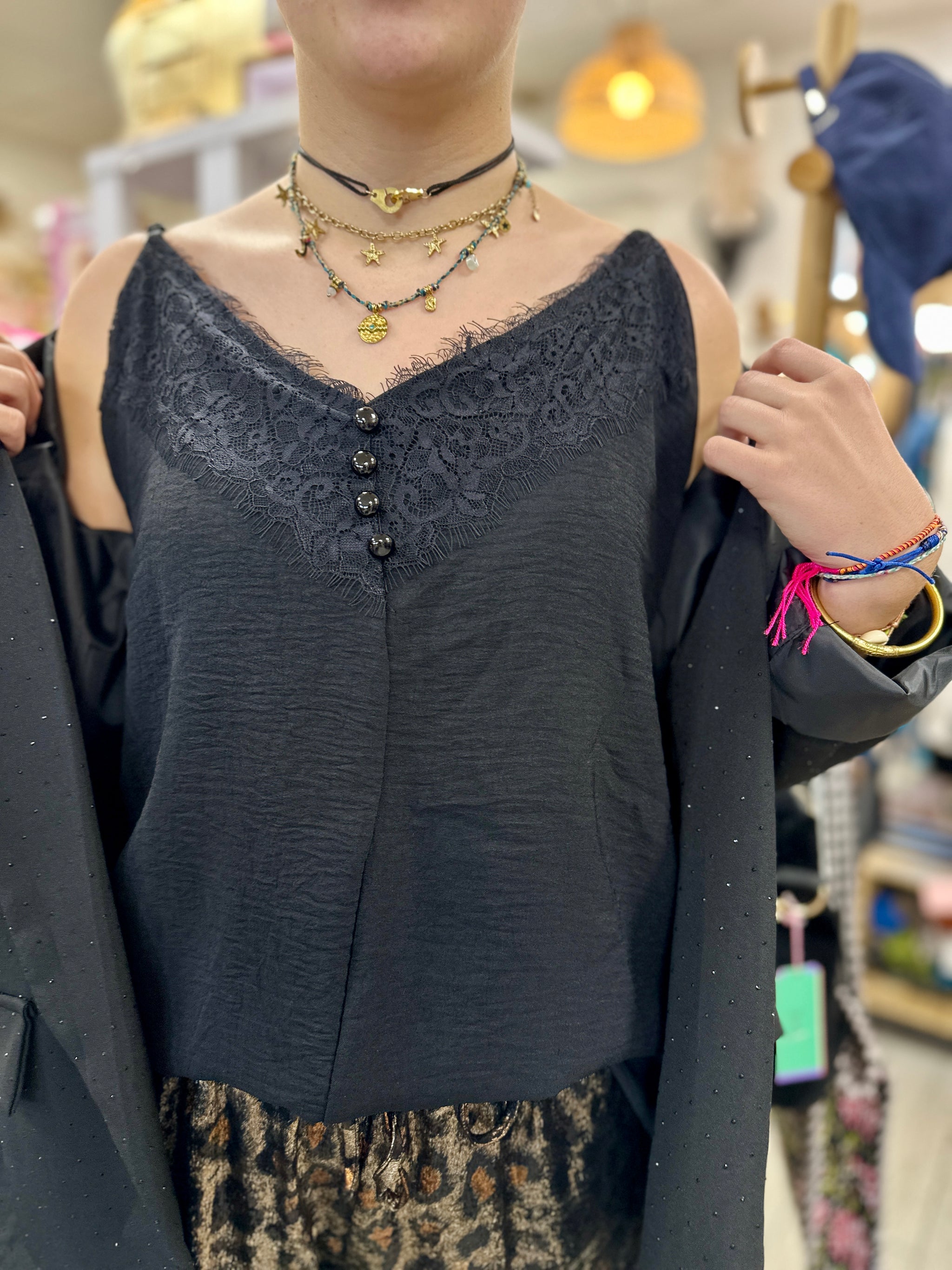 Léger, fluide et agréable à porter, il se distingue par son col V bordé de dentelle délicate et ses petits boutons sur le devant qui lui donnent une touche féminine impeccable.