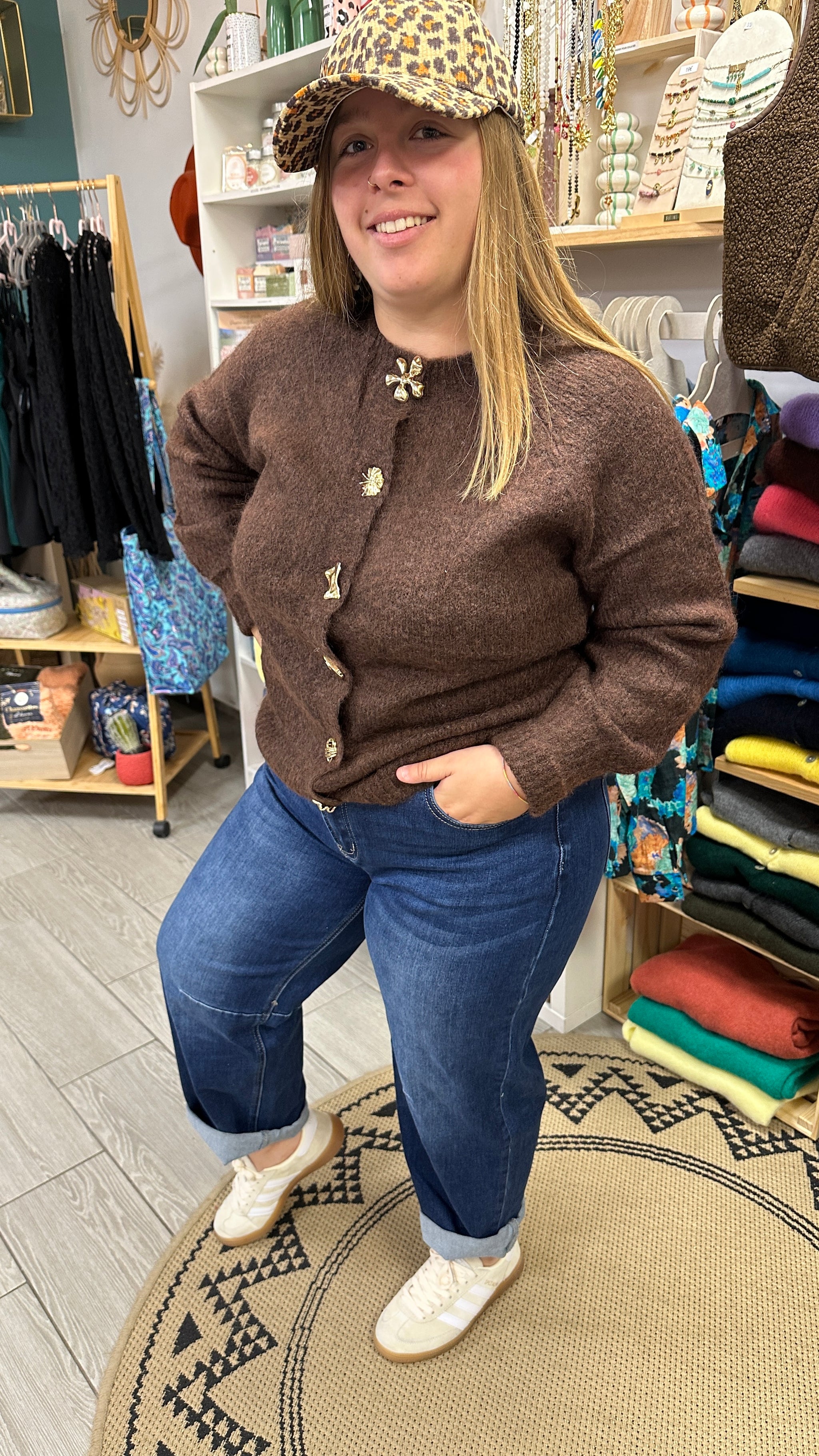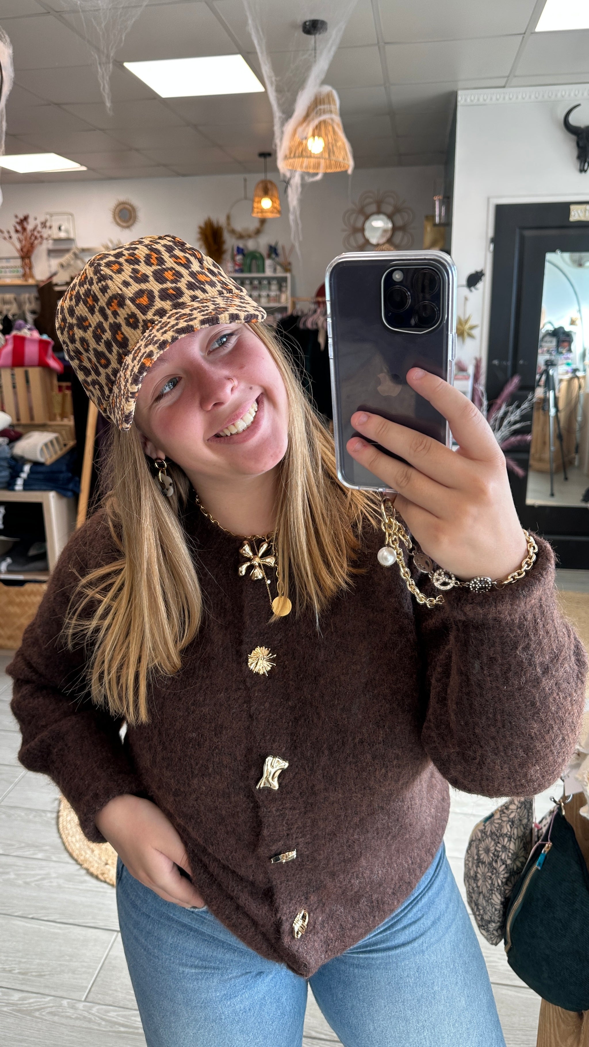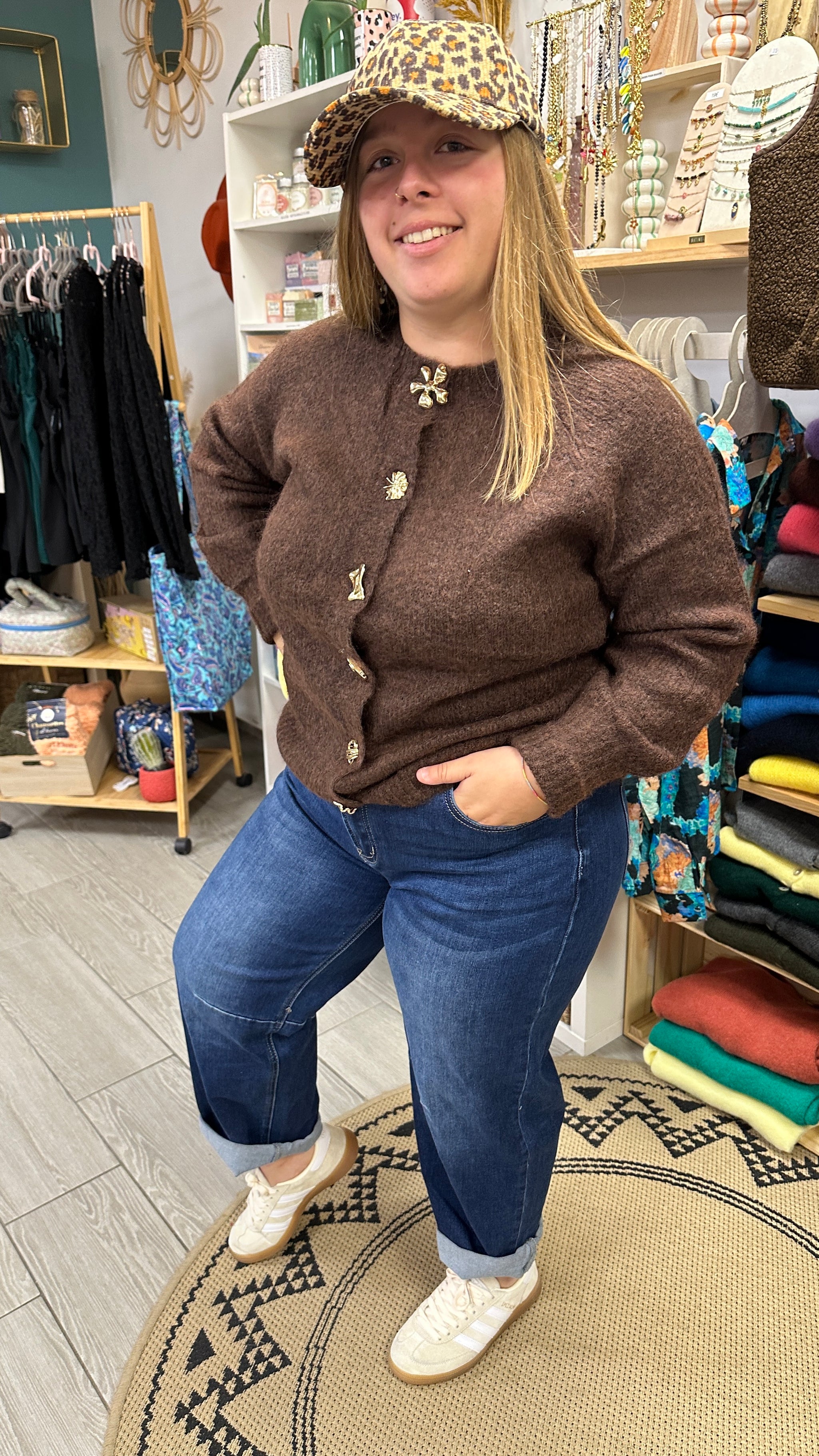 On craque pour sa couleur chocolat profond, sa coupe douce et enveloppante, et surtout ses gros boutons dorés en relief qui font toute la différence.