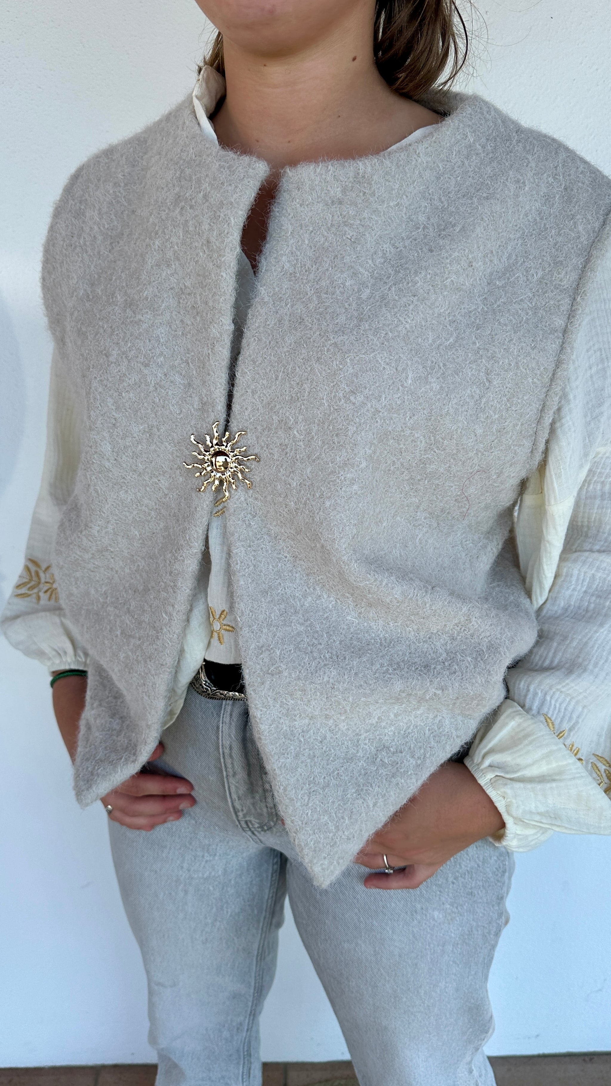 Texte alt 4 : Gilet chocolat sans manches en matière sherpa, gros plan sur la broche soleil– Abana Ustaritz 64990