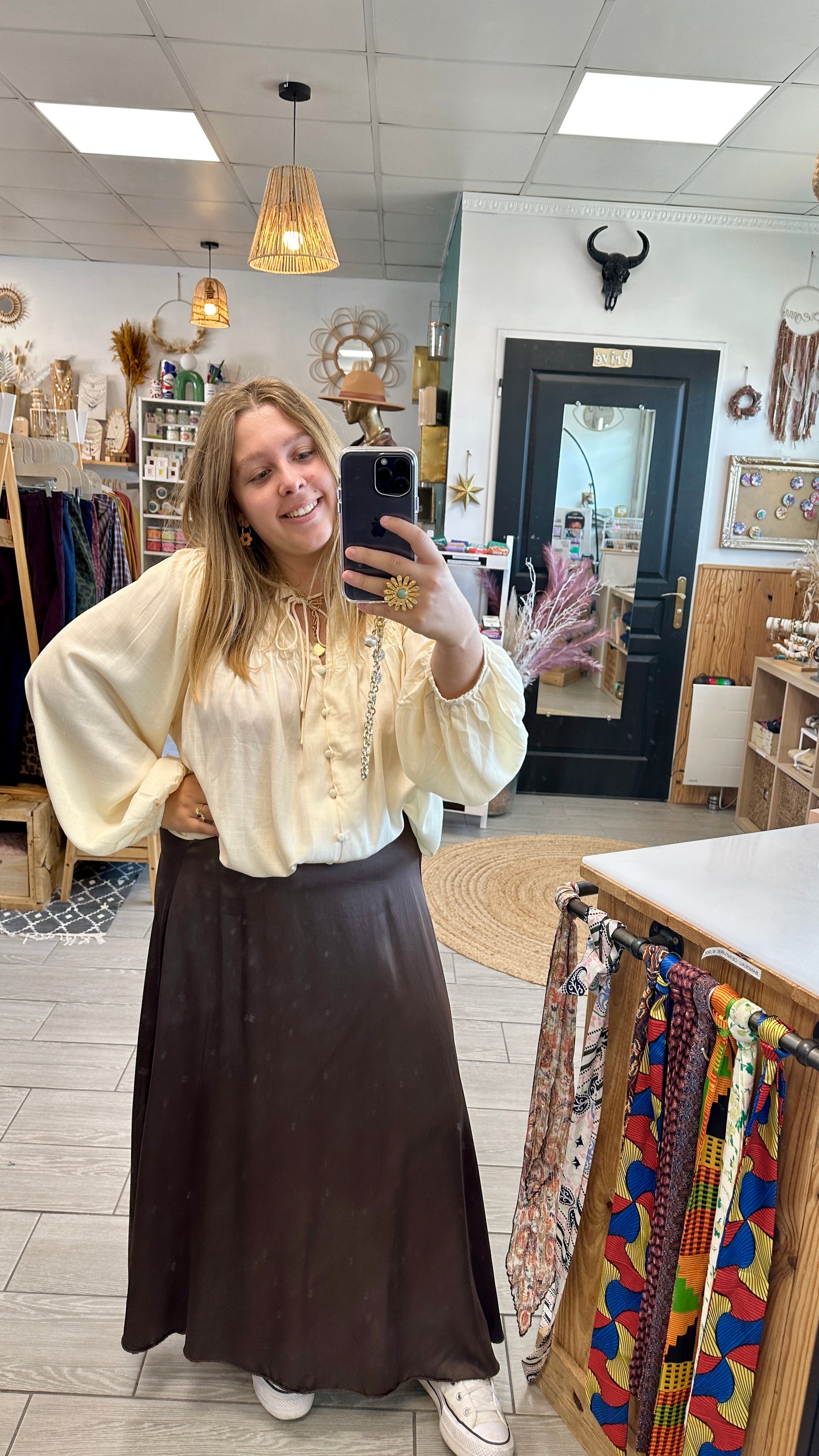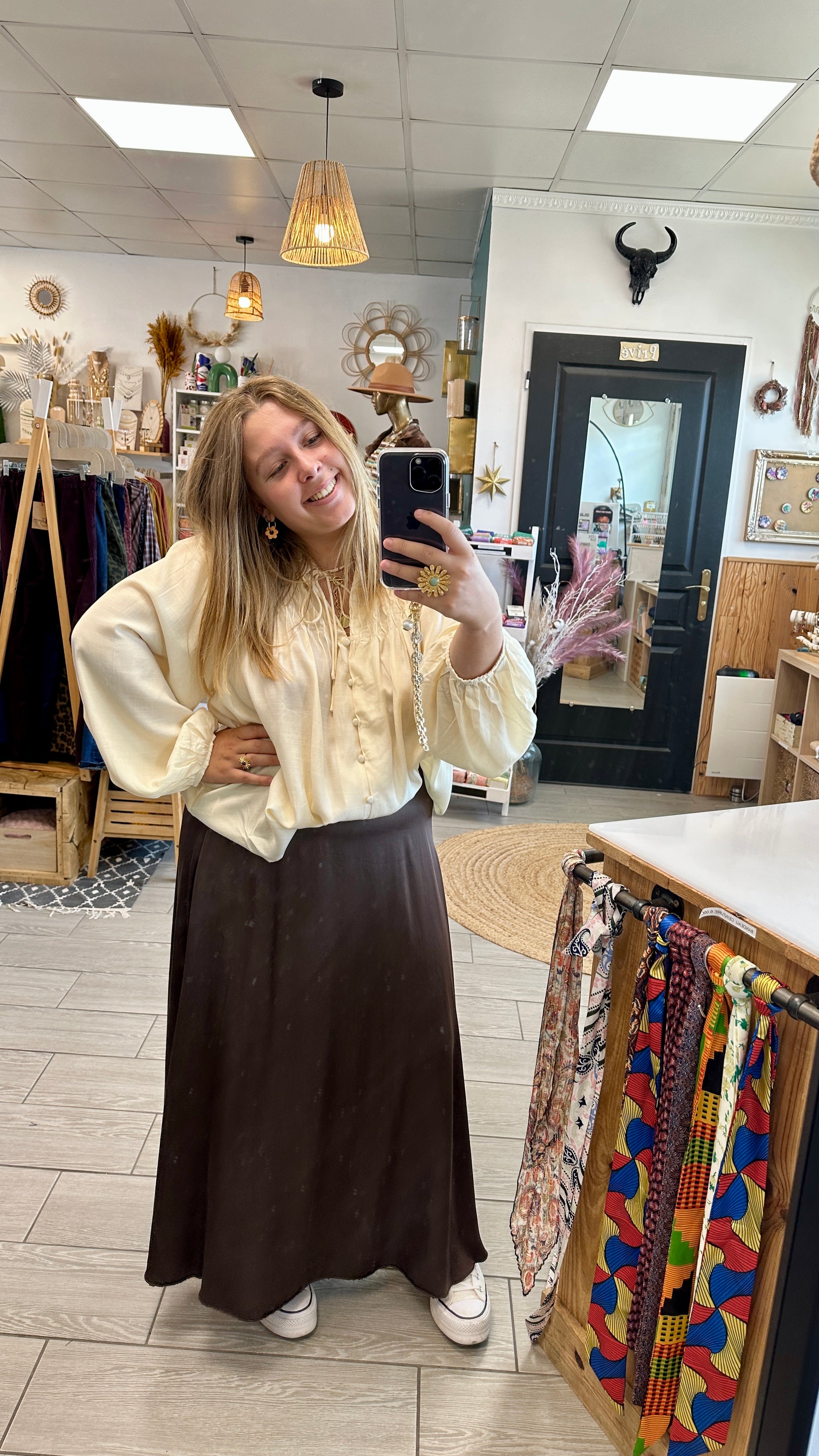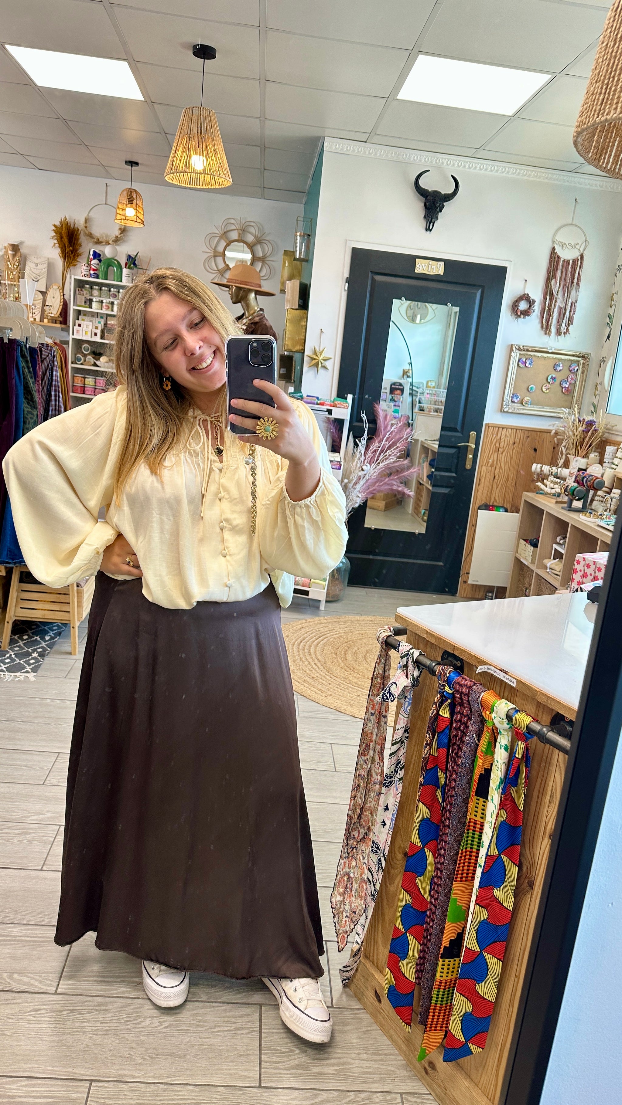 Craque pour notre jupe satinée Élégance, une pièce fluide et chic qui apporte de la lumière à ton look.