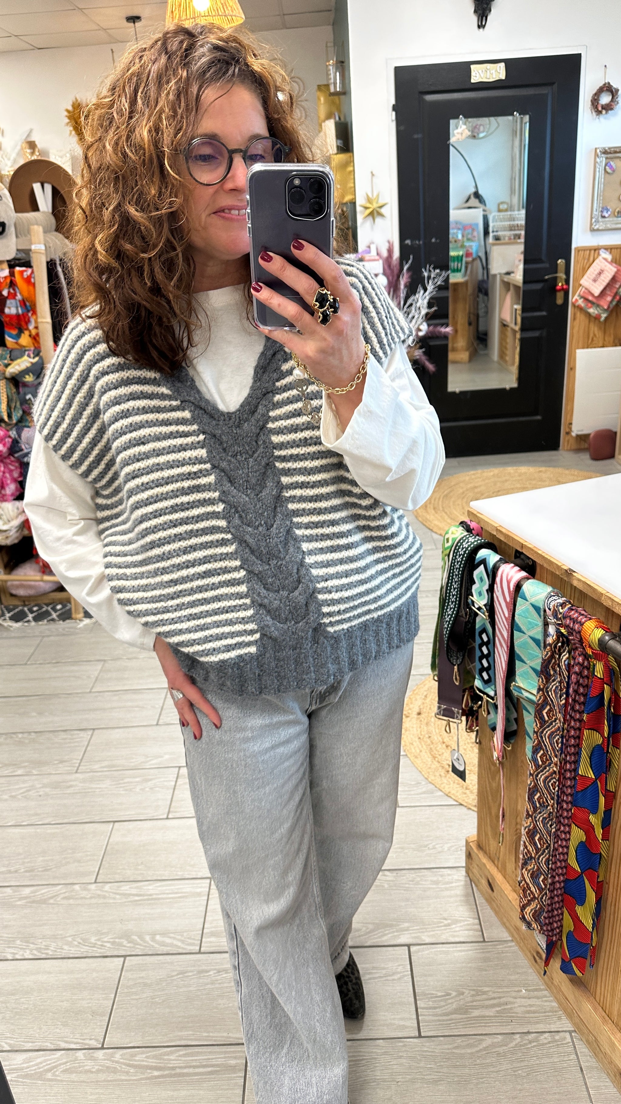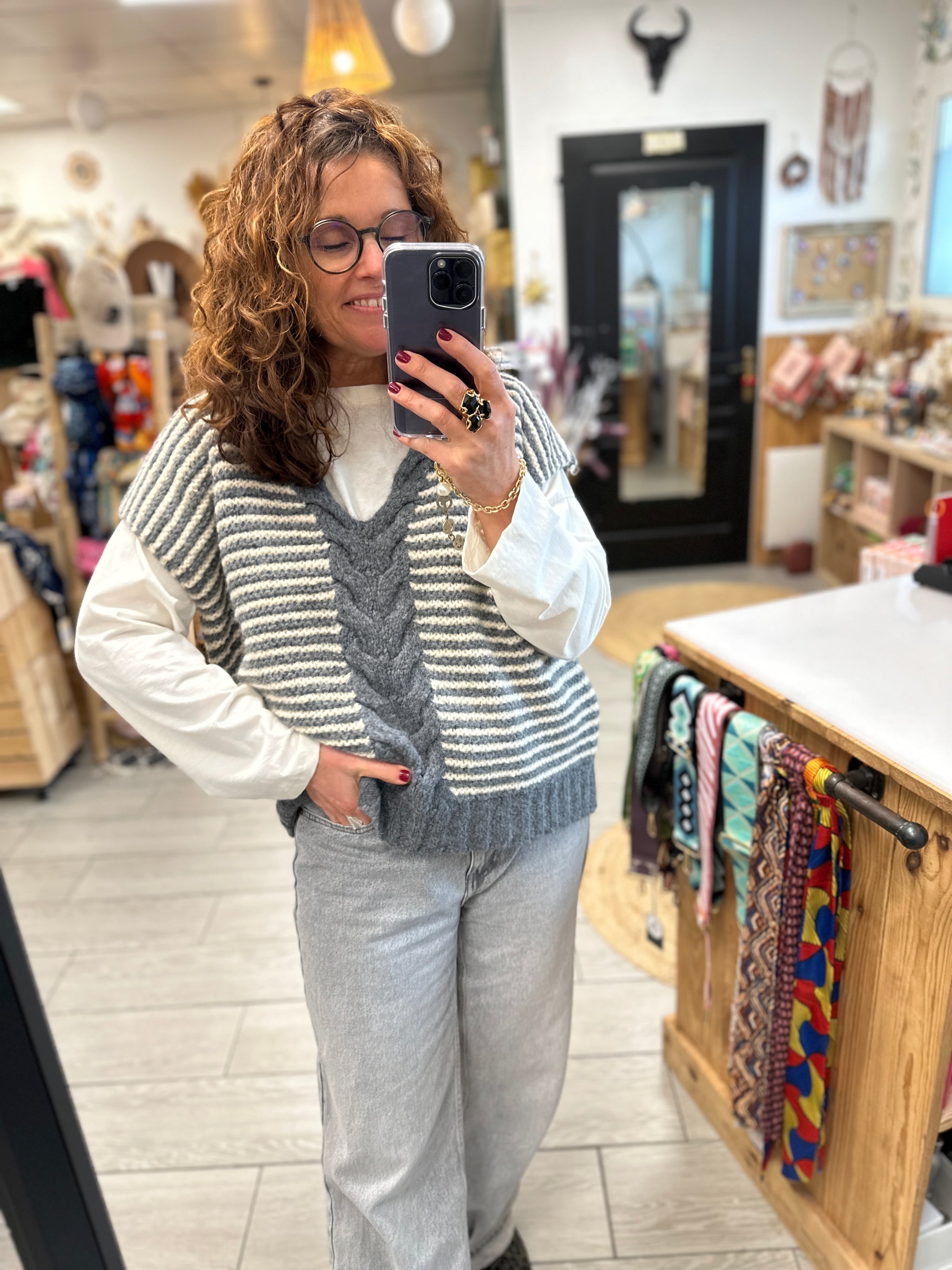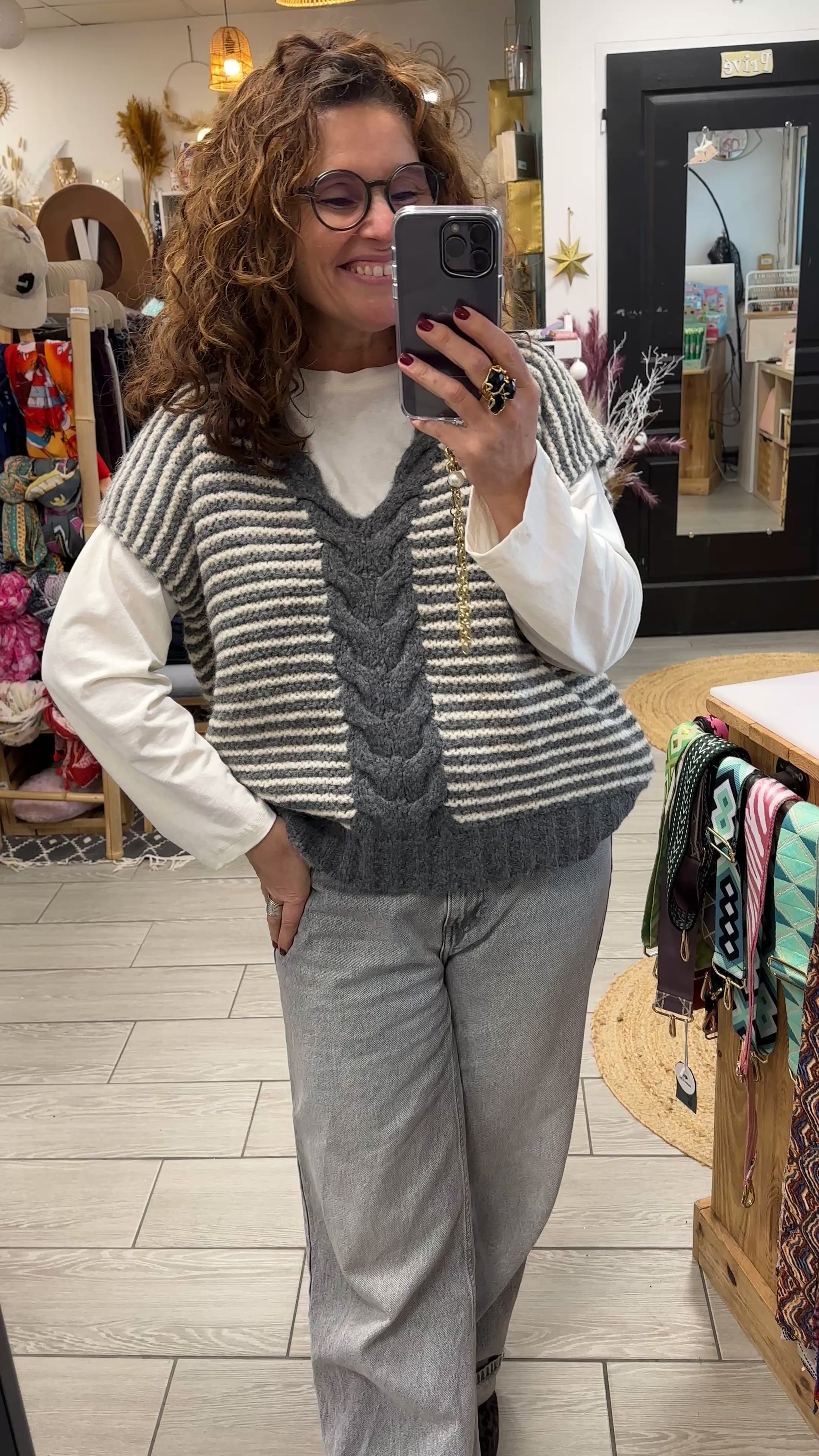 Avec ses rayures blanc et gris, son joli col V et ses détails en maille torsadée, il donne tout de suite du caractère à la silhouette.